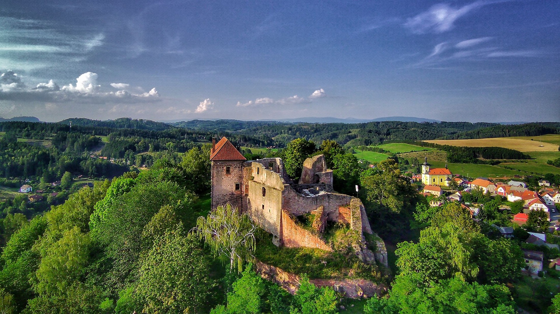 Zajímavosti na trase --- Hrad Pecka byl postaven na zakončení nevysokého, ve vrcholové části plochého, meziúdolního hřbetu orientovaného severojižním směrem. Ve své původní podobě byl hrad obklopen elipsovitým příkopem, z větší části uměle vylámaným do skály a z vnější strany ještě obehnaným valem. Největší lámací práce probíhaly na jižní a východní straně hradu, kde bylo nutné přirozené malé převýšení hradní elevace vůči okolí zvětšit. K hradu se dříve jezdívalo po dvou cestách. Jedna z nich vede ze západní strany až k bráně a druhá vede z města kolem hradního příkopu, který je už zasypaný.